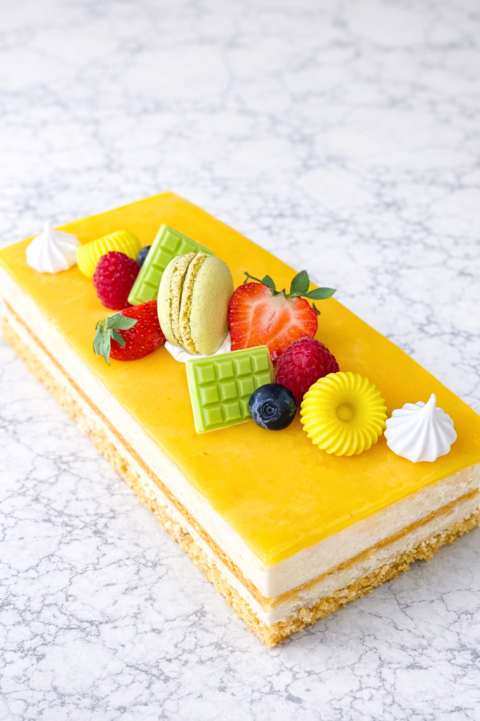 Mandulás felvert piskóta, joghurt mousse mangó betéttel és mangózselével a tetején